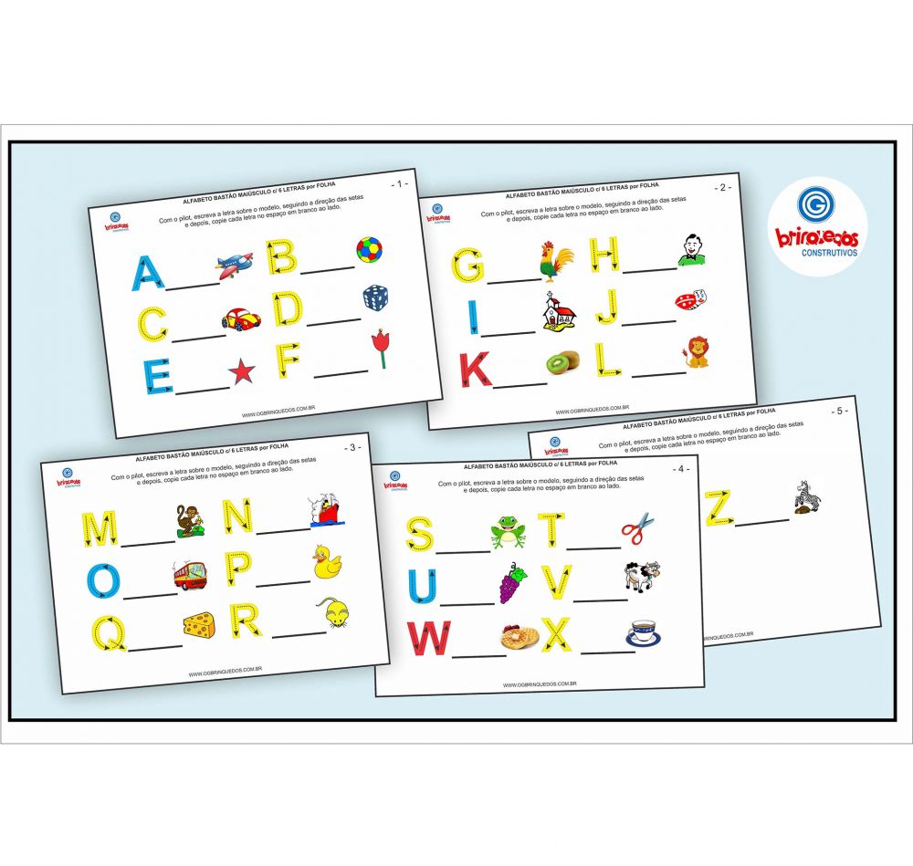 - 1 MÓDULO do ALFABETO BASTÃO MAIÚSCULO com 6 LETRAS por FICHA com setas para orientar o movimento da escrita de letra.