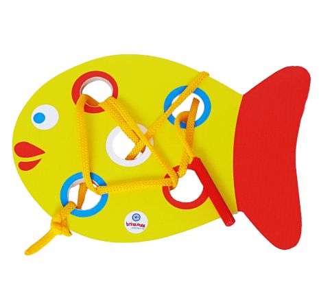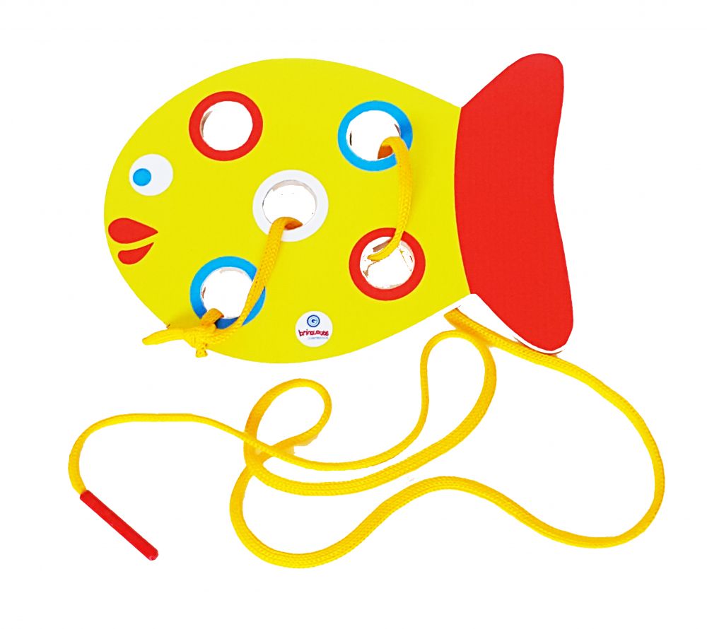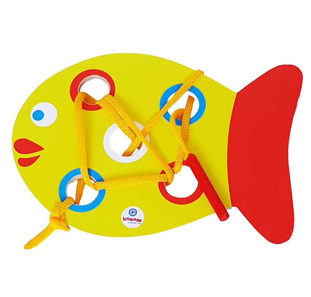 Os vazados no Peixe são grandes para facilitar a atividade de coordenação motora fina que o movimento de enfiar e desenfiar estimula.