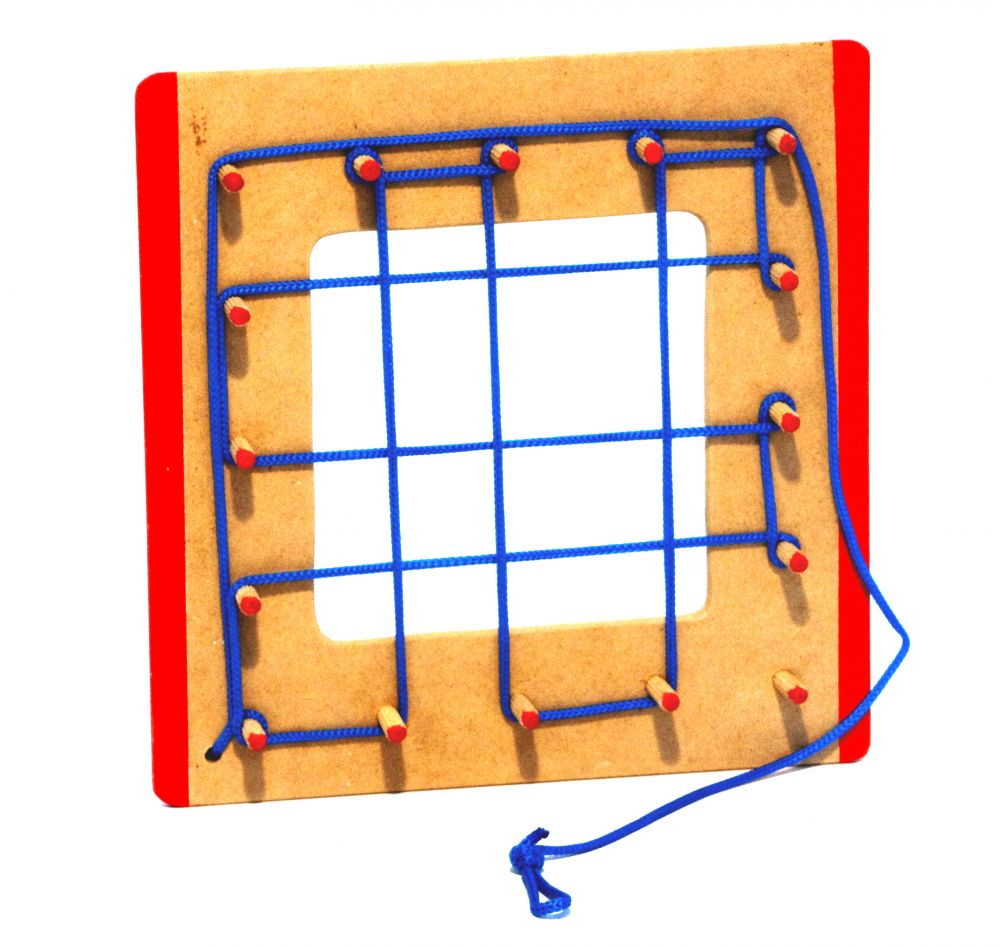Com movimentos bimanuais de alinhavo, laçar os pinos livremente ou criar formas geométricas.