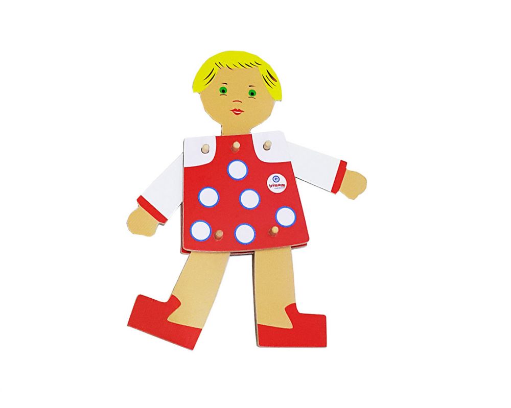 Colocar cada uma das 7 peças da boneca sobre uma folha de papel e utilizá-las como gabarito para riscar seu contorno, colorir, recortá-las e criar e criar uma nova boneca com roupinhas e expressões faciais diversas. As articulações dos braços, pernas, pescoço e uma roupinha extra podem ser construídas com "colchetes tipo bailarinas" ou as peças criadas podem ser coladas nas articulações para dar estrutura à nova boneca.