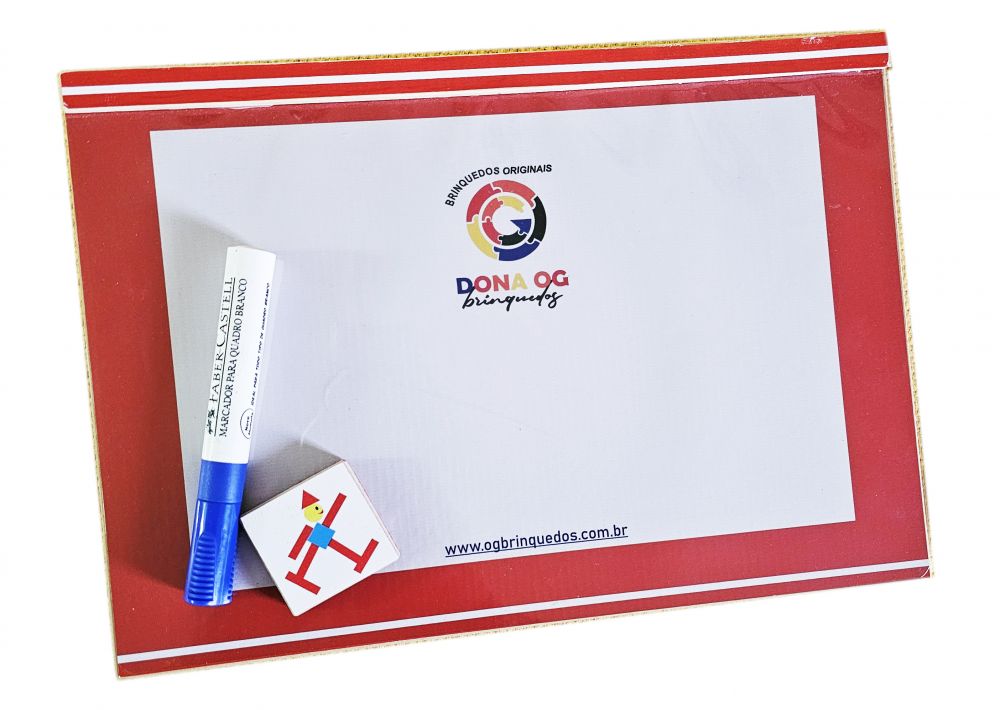 - ser utilizado como uma "ferramenta" para as FICHAS em papel A4 com atividades de conteúdos diversos e de coordenação visomotora com a CANETA PARA QUADRO BRANCO e com o KIT MAGNÉTICO de Dona OG Brinquedos.