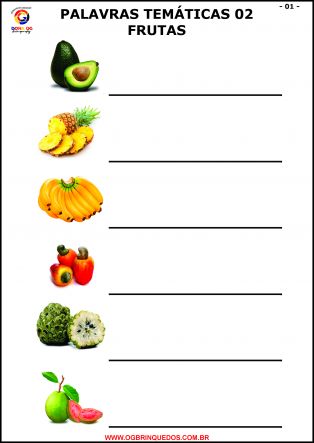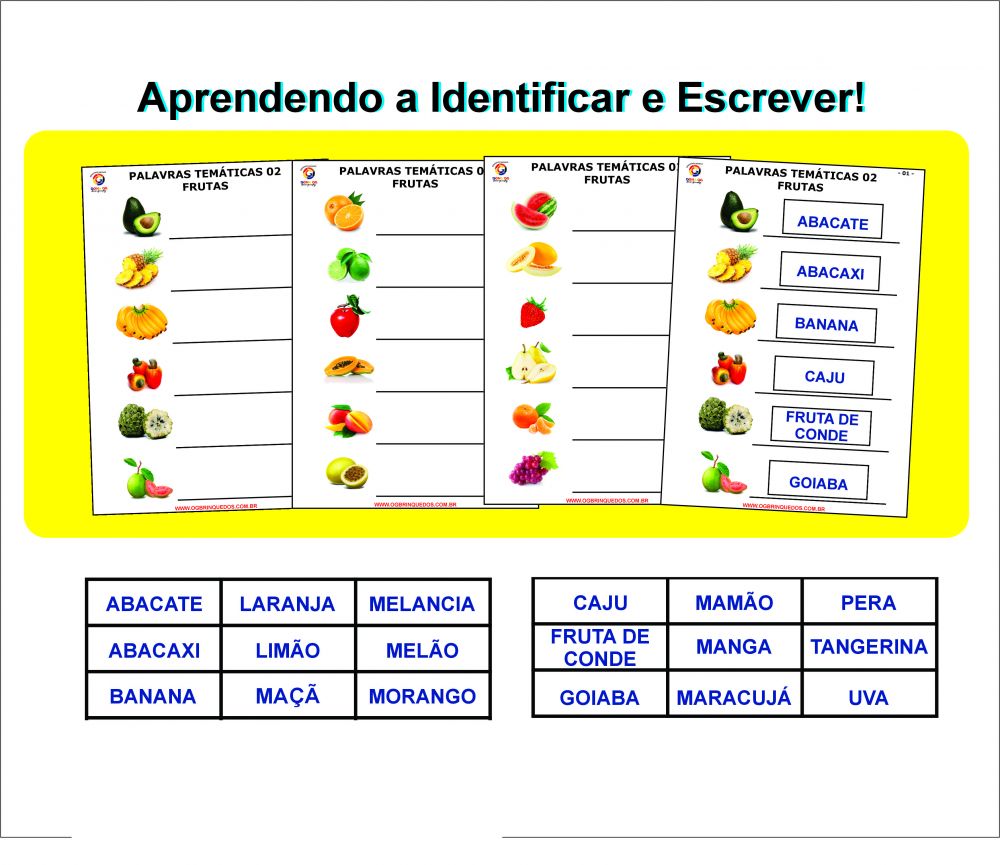 Este material pedagógico foi desenvolvido para auxiliar as crianças na identificação das frutas e na escrita correta de seus nomes, estimulando o raciocínio, a observação e a coordenação motora fina.